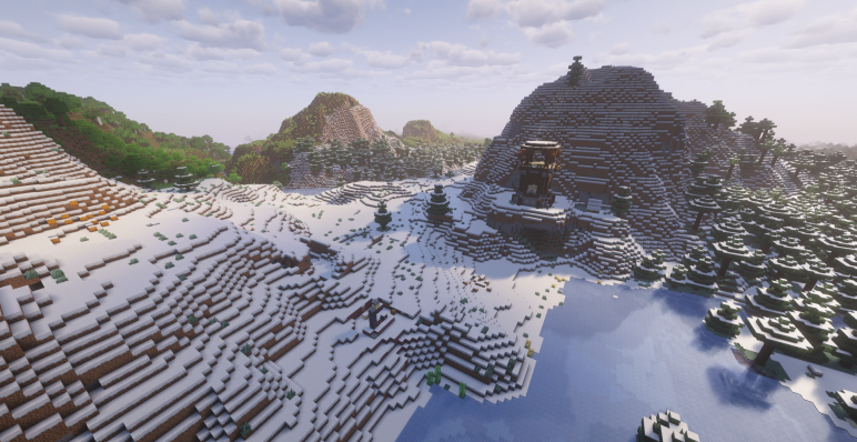 Этот сид переносит игрока прямо на небольшую часть биома заснеженных равнин, где морозный ветер и открытые просторы сразу создают ощущение сурового выживания. Но уже в первые минуты в округе оказывается удивительно много структур — от порталов и аванпостов до камер испытаний и тайных руин.