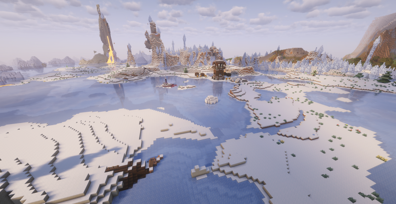Игрок появляется на координатах (48, 32) на спокойных равнинах, недалеко от берега. Чуть дальше рельеф сменяется заснеженными равнинами, создавая атмосферное сочетание мягкой зелени и ледяных просторов. Уже отсюда можно заметить ледяные платформы и редкие постройки вдалеке — предвестники уникального стартового опыта.