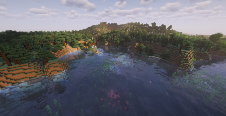 Этот мир встречает игрока тихо и спокойно, без резких испытаний и опасных врагов в первые секунды. Спавн происходит рядом с берегом в таежном биоме на координатах (128, 144). Хвойные деревья тянутся вдоль воды, их отражения медленно колышутся на поверхности, а вокруг царит ощущение забытого края, где время будто остановилось. Уже здесь становится ясно: это сид для тех, кто любит исследовать и наблюдать, а не спешить вперед сломя голову.