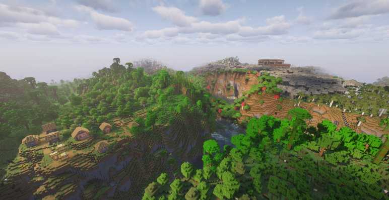 Этот сид переносит игрока в уютное место: широкие равнины, окруженные вишневой рощей. Старт здесь спокойный, живописный и идеально подходит для строительства первой базы. Но самое интересное скрывается не на спавне — оно ждет чуть дальше, где биомы и структуры переплетаются в редкое сочетание приключений.