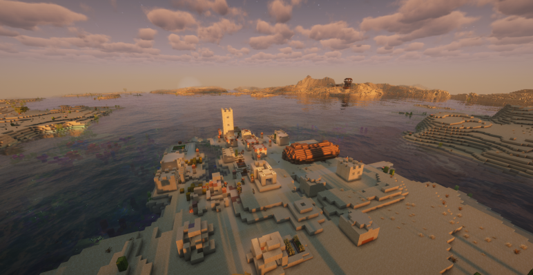 Самой первой находкой становится пустынная деревня, расположенная на краю берега на координатах (64, 16). Поселение выглядит особенно интересно из-за своего расположения: часть домов стоит рядом с водой, создавая красивый пейзаж.
