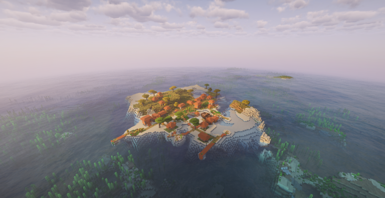 Этот сид дарит игроку один из самых атмосферных стартов — вы появляетесь на маленьком острове теплого океана, где саванна встречается с песчаными пляжами, а синяя гладь воды тянется до самого горизонта. Несмотря на изолированность, остров полон жизни и скрытых сюрпризов.