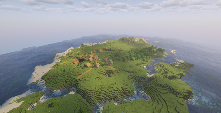 Первая деревня находится на координатах (64, 48) — небольшое поселение у побережья, где можно найти фермы с пшеницей и морковью, а также сундуки с полезным лутом.