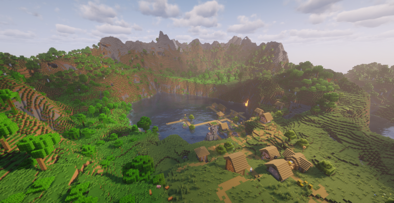 Прямо на берегу озера раскинулась уютная деревня, часть которой выходит на небольшие равнины. Благодаря соседству с джунглями, домики стоят среди зелени, а местность вокруг идеально подходит для старта: есть вода, леса, ровные участки для базы и приятные виды.
