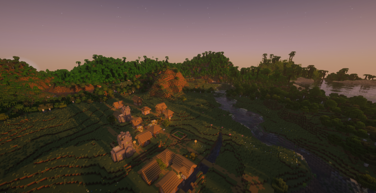 Если перейти из тропического леса в более спокойные равнины, то на координатах (72, -264) игрок найдет деревню. Она идеально подходит для того, чтобы обосноваться: здесь можно торговать с жителями, выращивать урожай, добывать ресурсы и построить свою первую базу. Сочетание теплого климата джунглей и открытых пространств равнин создает идеальное место для комфортного выживания.