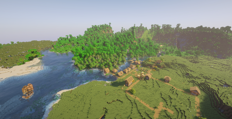 Чуть дальше вдоль течения, на координатах (-272, 16), расположилась деревня, частично стоящая прямо на реке. Некоторые дома находятся на воде, что придает поселению особую атмосферу. Эта деревня разделяет два биома — джунгли и равнины, позволяя сочетать экзотику с классическим пейзажем.