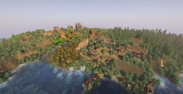 Если направиться на восток, примерно к координатам (256, 96), густая растительность постепенно сменится тайгой. Именно здесь расположилась первая деревня, уютно спрятавшаяся среди хвойных деревьев. Тайга также богата животными и нередко встречаются волки, которых можно приручить.