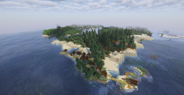 Продвигаясь дальше вдоль берега, игрок выходит к таежной деревне на координатах (80, -160). Дома из темного дерева, окруженные елями, выглядят особенно уютно.