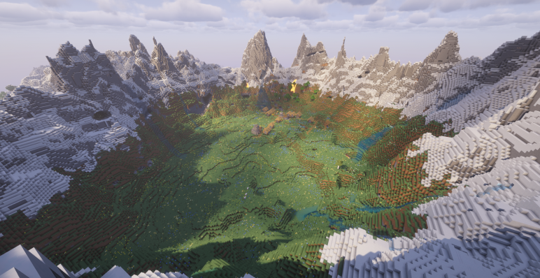 Этот сид подарит игроку живописное, но суровое начало: кольцо снежных вершин, скрытая деревня и древний город под ногами создают атмосферу укромности и опасности одновременно. А если выйти за пределы ледяного кольца, мир раскрывается во всей полноте: разрушенные порталы, камеры испытаний, деревни, биомы и затонувшие корабли.