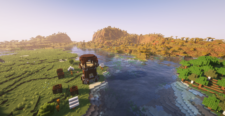 Путешествие начинается в густом лесу, который плавно переходит в биом джунглей. Рядом протянулась широкая река, а на горизонте виднеются возвышенности саванны. Такой старт задает динамику всему выживанию и дарит ощущение приключения с первых минут.