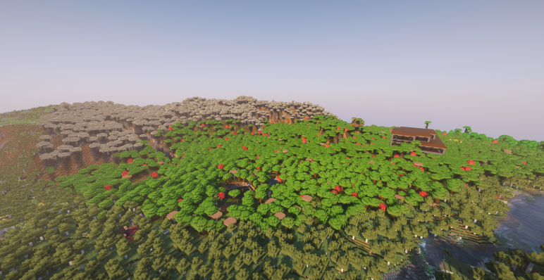 Если двигаться дальше на восток, березовая роща постепенно переходит в темный лес. Это густые, почти непроницаемые заросли с огромными дубами и грибами. Именно здесь, на координатах (488, 200), возвышается особняк — одно из самых опасных и впечатляющих строений Майнкрафт. А за особняком, если подняться выше по склону, открывается бледный сад — холм, покрытый серыми травами и деревьями.
