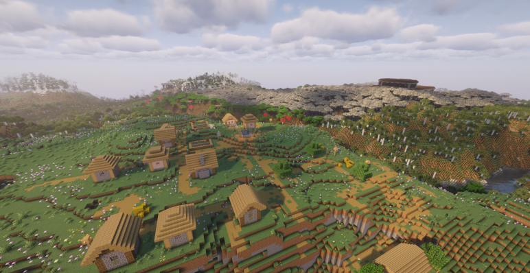 Продвигаясь за снежные склоны, игрок обнаружит деревню, расположенную практически на границе необычного и редкого биома — бледного сада. Ее координаты — (-944, -144).