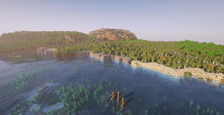 Игрок появляется на небольшом островке на равнинах, рядом с густым зеленым лесом (32, -64). Уже с первых минут видно, что мир обещает множество открытий — стоит лишь сделать несколько шагов в разные стороны.