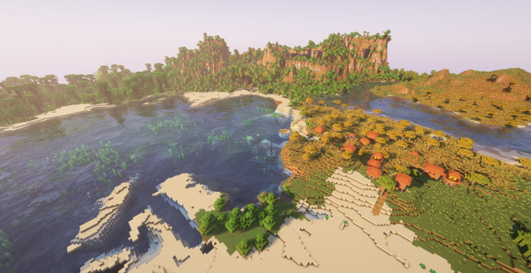Этот мир сразу бросает игрока в удивительное окружение, где биомы и структуры сочетаются так, что буквально каждый шаг сулит новые открытия. С самого старта вы появляетесь на небольшом острове, окруженном рекой в биоме саванны. Такое место выглядит живописно и удобно для выживания: рядом есть деревья, животные и вода, а вокруг раскинулись разнообразные ландшафты.
