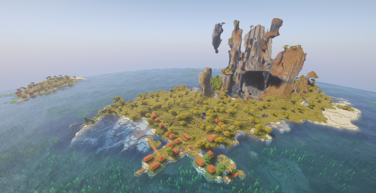 Точка спавна расположена на острове в биоме саванны с координатами (-240, 400). Уже с первых минут выживания вид поражает своей живописностью: вокруг возвышаются высокие скалы, по склонам которых растут акации, а над землей парят висячие островки, будто застывшие в воздухе.