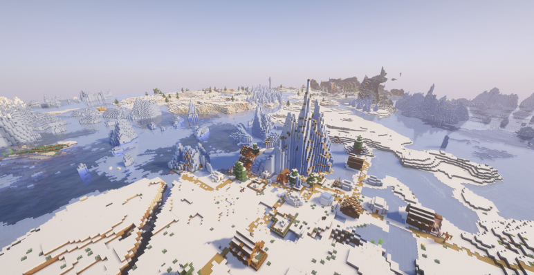 Если отправиться от спавна на запад, на координаты (-384, 224), путешественника ждет небольшая деревня, приютившаяся среди сугробов. Некоторые дома стоят прямо на льду, а вид из окна открывается на замерзшее озеро — настоящее зимнее убежище.