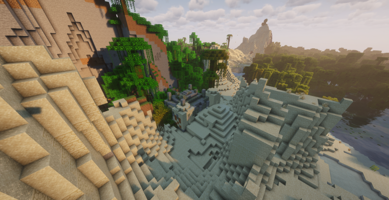 Два храма прямо на спавне, редкие биомы по соседству, дополнительный храм на острове, деревня и портал поблизости делают этот мир насыщенным и динамичным. Здесь буквально каждый шаг от точки появления открывает новую структуру и превращает начало игры в увлекательное приключение.
