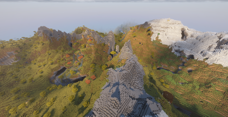 Продвигаясь вперед, лес постепенно уступает место саванным просторам, где земля становится рыжей, а деревья — низкими и плоскими. Через этот биом протекает широкая река, на берегу которой уютно расположилась деревня на координатах (368, -224).