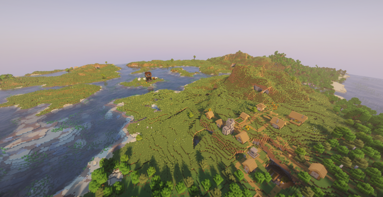 Путешествуя по равнинам, игрок рано или поздно наткнется на жутковатое зрелище — зомби-деревню на координатах (-224, 240). Заброшенные дома, паутина и редкие огни костров создают атмосферу былого поселения, захваченного нежитью. К тому же рядом протекают несколько рек, разделяющих территорию на островки и делая окрестности особенно живописными.