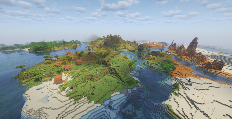 Игрок появляется посреди широкого и сурового биома пустоши. Коричневые скалы, потрескавшаяся земля и практически полное отсутствие растительности создают чувство заброшенности. Но уже совсем рядом видно, что мир не так пуст: впереди появляется узкий кусок пустыни, а чуть дальше — биом саванны, где растут акациевые деревья.
