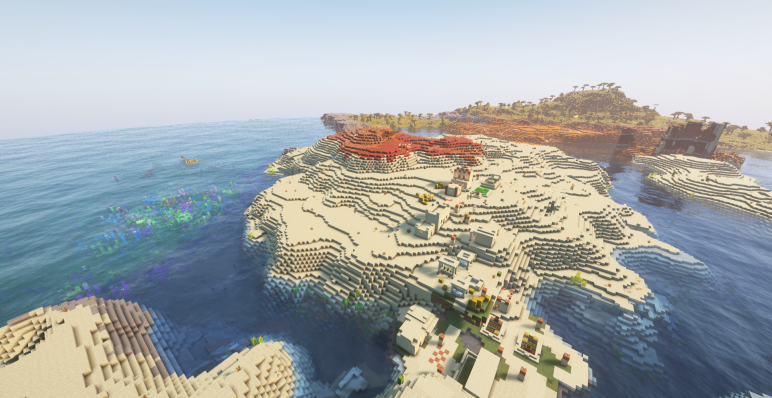 Все самое интересное в одном месте: живописный пустынный остров, деревня с жителями, затонувший корабль с сокровищами, подводные руины и монумент, храм пустыни, разрушенный портал и, самое главное, — крепость Края недалеко от спавна. Это значит, что мир можно пройти полностью, не отправляясь в долгие поиски структур.