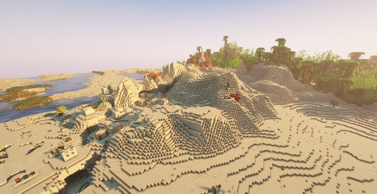 Здесь есть и суровая пустыня с сокровищами, и подводные руины с кораблем, и деревня для выживания, и даже два храма — пустынный и джунглевый. А разрушенный портал и пышные пещеры делают карту еще более разнообразной.