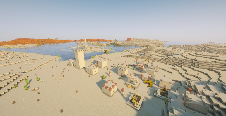 Уже с первых шагов можно заметить, что пустыня здесь не безжизненна. По обе стороны от точки появления расположены две крупные деревни: первая на координатах (128, 320), а вторая — (128, -192). В них можно отдохнуть, обменяться с жителями и раздобыть стартовые ресурсы. Эти деревни стоят как стражи по обе стороны оазиса, охраняя сердце пустыни.