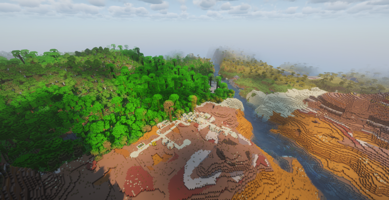 Этот сид идеально подойдет тем, кто любит путешествие с яркими контрастами: от густых джунглей до суровых пустошей, от каньонов до скрытых подземных структур. Вокруг точки спавна буквально на каждом шагу есть что исследовать — деревня, храмы, порталы, камеры испытаний.