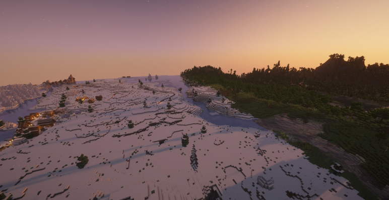 Здесь есть тепло и зелень тайги, суровая красота снежных равнин, высокие ледяные пики, две деревни, иглу с подвалом и руины древностей. Все это в пределах пары сотен блоков от точки спавна. Такой мир идеально подойдет для выживания, путешествий и строительства базы мечты, ведь каждая сторона от спавна открывает совершенно новое приключение.