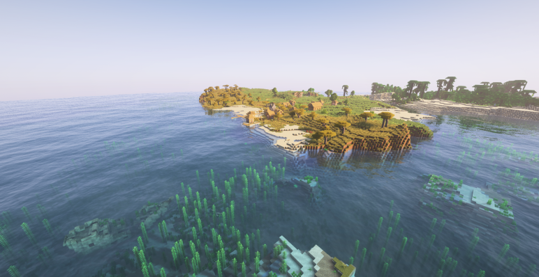Игрок начинает свое путешествие на небольшом острове с равнинами (координаты -80, 352). Уже с первых минут мир подталкивает исследовать окрестности: рядом спрятаны корабли, деревня, храм в джунглях и даже руины былых времен. А награды в сундуках действительно стоят того, чтобы рискнуть.