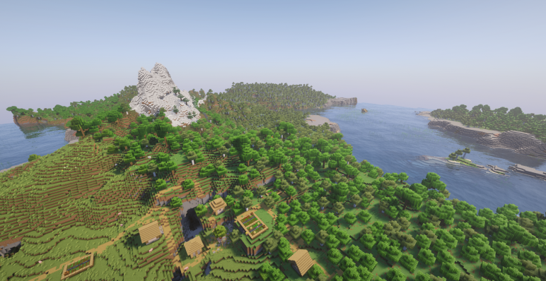 Этот сид идеально подойдет для тех, кто любит исследования, красивые виды и атмосферу древних загадок. Вокруг спавна — обломки кораблей, деревни, порталы и даже следы древних руин. Все это делает мир насыщенным и интересным с первых минут.