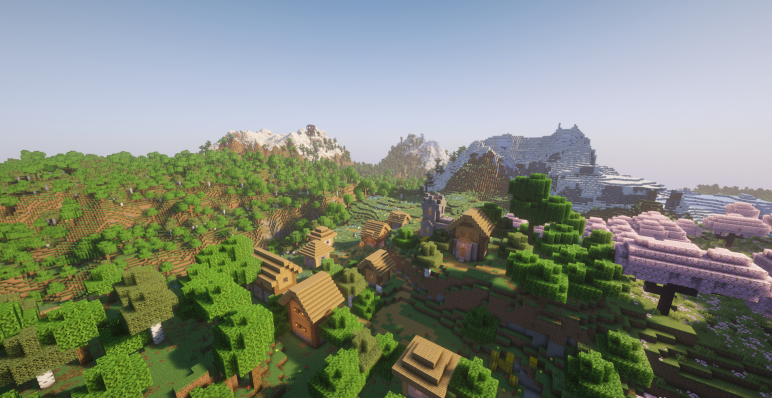 Неподалеку от этих двух аванпостов, на еще одном холме, расположилась деревня на кусочке равнин. Она граничит сразу с несколькими биомами — лесом, вишневой рощей и замерзшими вершинами, создавая потрясающий контраст цветов и форм.
