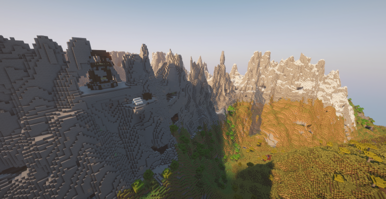 Мир начинается в саванне, где теплый ветер колышет траву, а высокие акации создают уютную тень. Это просторное и солнечное место идеально подходит для строительства базы — здесь ровная местность, легко найти животных, а поблизости много интересных точек, куда можно отправиться уже в первые минуты игры. С одной стороны — дикая природа, с другой — неприступные зубчатые вершины, возвышающиеся над равниной.