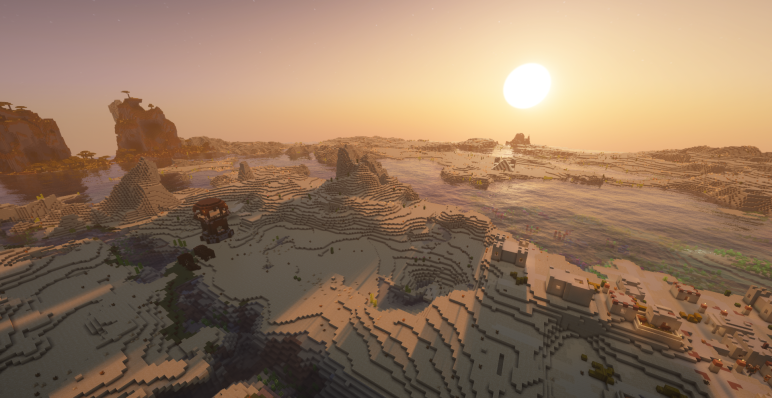 Спавн происходит в биоме выветренной саванны, где вокруг растут редкие акации и высокий выжженный травяной покров. Прямо рядом начинается пустыня, что делает место старта особенно живописным и контрастным. С одной стороны — мягкие цвета саванны и каменистые холмы, а с другой — бескрайние песчаные дюны, которые манят исследователя вперед.