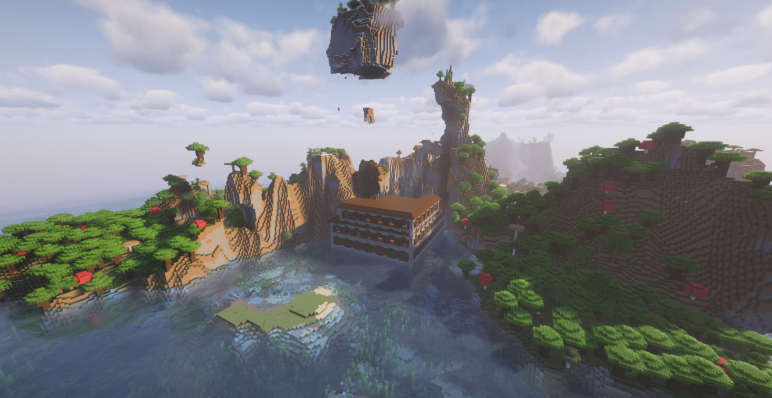 Рельеф неровный, с обрывами и возвышенностями, что делает исследование особенно интересным. Это отличное место как для выживания, так и для постройки необычной базы с видами на разные биомы.