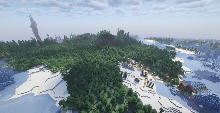 Игрок появляется в густом биоме реликтовой еловой тайги, окруженном обычной тайгой и снежными равнинами. Вокруг возвышаются массивные ели, мягко скрипящие на ветру, а дальние заснеженные просторы создают атмосферу хардкорного северного выживания.