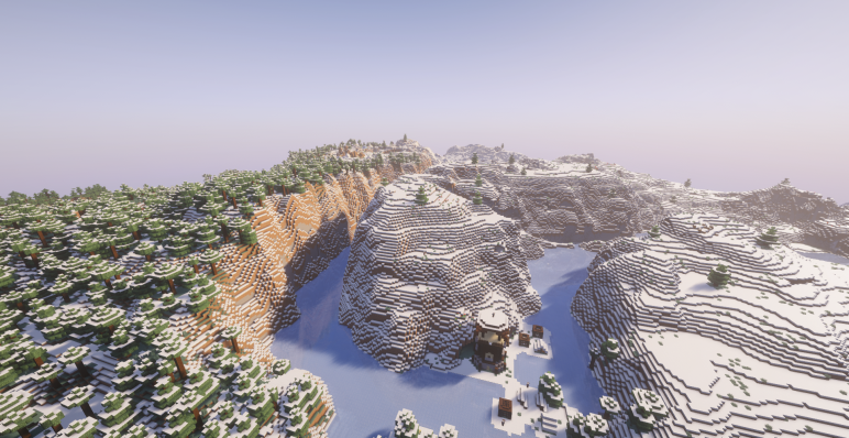 Если отправиться в противоположную сторону от спавна, то на холме можно обнаружить вторую деревушку (-272, 224). Она уютно разместилась среди заснеженных елей. Рядом с ней стоит иглу без подвала (-264, 312) — отличное убежище на случай ночи или метели.