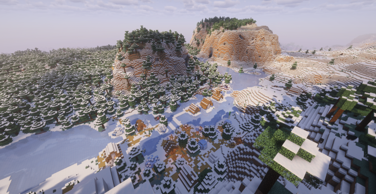 Этот сид отправляет игрока в живописный уголок мира — на стыке тайги, снежной тайги и равнин. Мягкие зеленые леса соседствуют со снежными березами и ледяными реками, создавая идеальное место для начала приключений. Но главное — мир вокруг спавна буквально нашпигован интересными структурами.