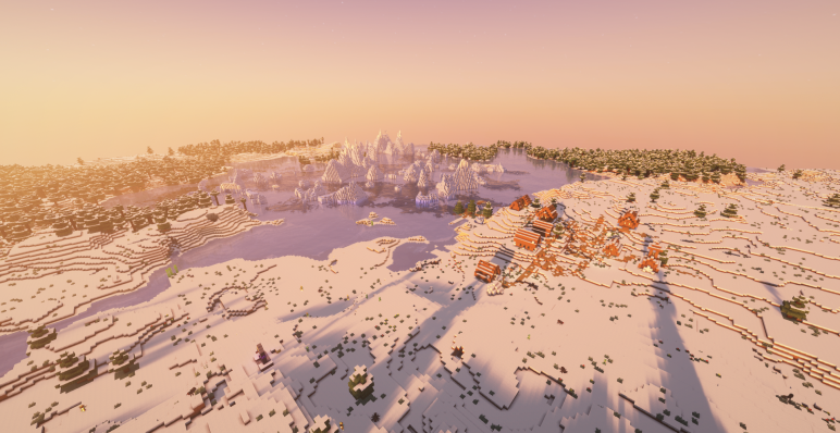 Спавн расположен прямо в тайге, окруженной снегом и ледяными просторами (-400, 64). Здесь вы окажетесь среди вечной зимы, где белые равнины тянутся до горизонта, а неподвижный замерзший океан хранит в себе массу тайн.