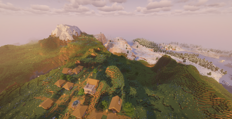 Этот сид идеально подходит для тех, кто любит насыщенное исследование без долгих походов. В окружении спавна находятся: три деревни, руины былых времен, разрушенный портал, открытая иглу с подвалом, контраст биомов, делающий путешествие особенно разнообразным.