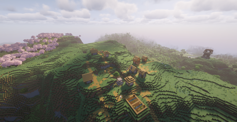 Игрок появляется рядом с крупной возвышенностью, на вершине и склонах которой раскинулся биом вишневой рощи. Розовые кроны деревьев мягко контрастируют с зелеными равнинами и создают ощущение почти сказочного мира. Уже в первые секунды после спавна становится ясно — этот сид идеально подойдет тем, кто ценит красивые пейзажи, но при этом хочет получить насыщенный геймплей без долгих путешествий.