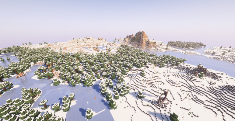 Игрок появляется на координатах (-16, -48), прямо среди заснеженных равнин. Уже с первых минут становится ясно, что исследование этого мира будет увлекательным, ведь буквально со всех сторон расположены интересные структуры.