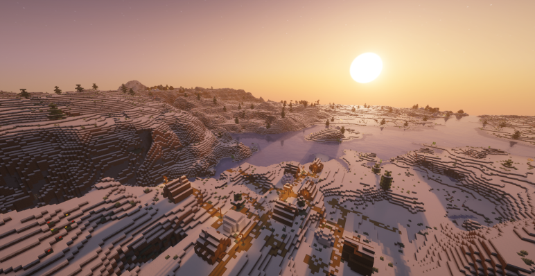 Идеальный сид для любителей зимнего выживания и редких находок. Вас ждут тайное иглу, вмерзший в лед корабль, подводные руины, два разрушенных портала и целых две деревни, готовые принять исследователей.